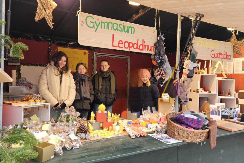 Am 17. Dezember 2025 war das Gymnasium Leopoldinum erneut mit einem eigenen Stand auf dem Passauer Christkindlmarkt vertreten – und das mit großem Erfolg. Bei winterlicher Stimmung und reger Besucherzahl fanden Glühwein und Kinderpunsch ebenso großen Anklang wie die zahlreichen handgefertigten Produkte. Von Bienenwachskerzen über Strickwaren bis hin zu verschiedenen Holzartikeln reichte das vielfältige Angebot.