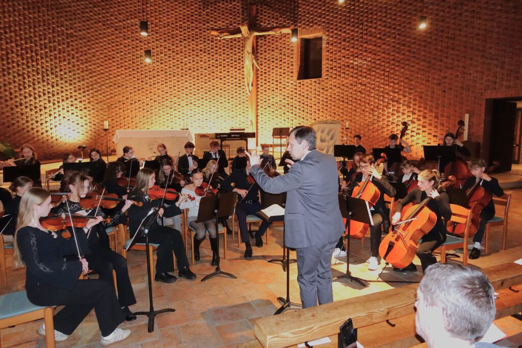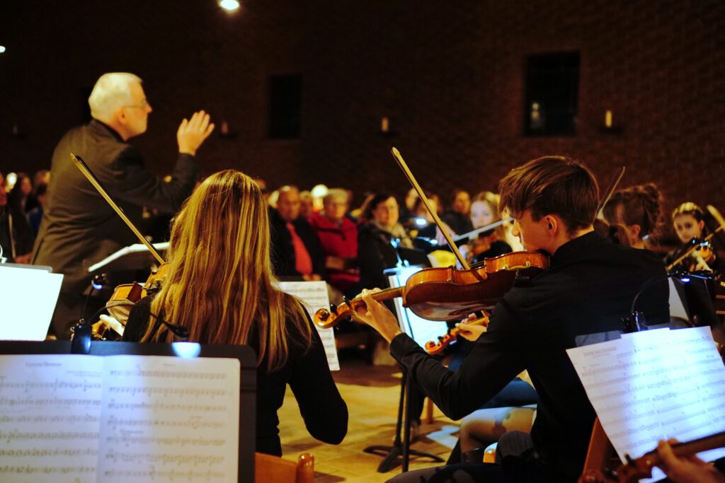 Es folgten beeindruckende orchestrale Kontraste: Während das große Orchester, sicher dirigiert von Daniel Obtmeier, mit geschickt arrangierten Werken wie einem „Concerto grosso“ von Georg Friedrich Händel oder Beethovens „Egmont-Ouvertüre“ überzeugte, glänzte das Kammerorchester unter der Leitung von Klaus Albrecht durch dynamische Raffinessen bei Saint-Saëns’ „Danse bacchanale“ oder der „Berceuse“ von Kjell Marcussen.
