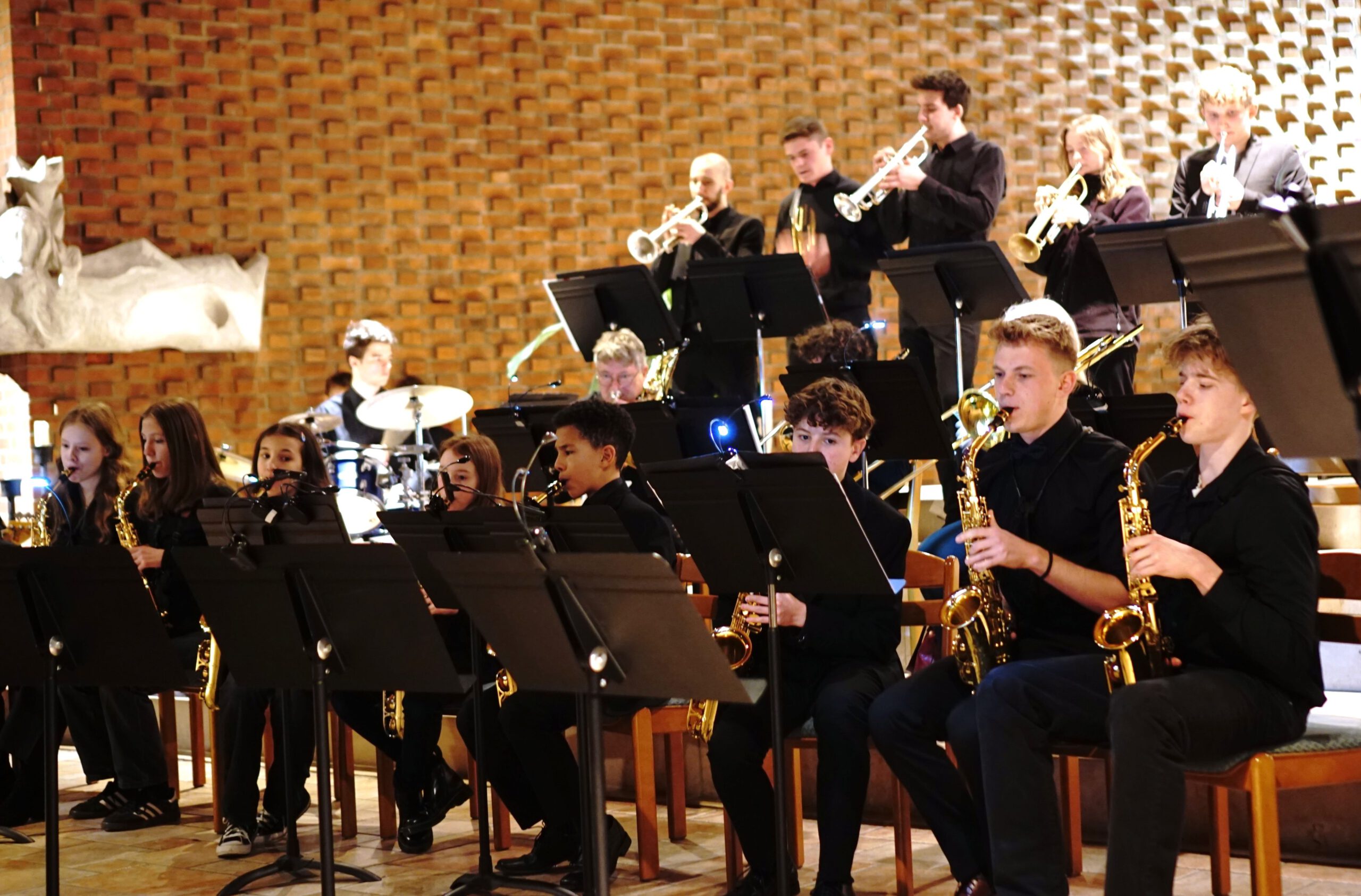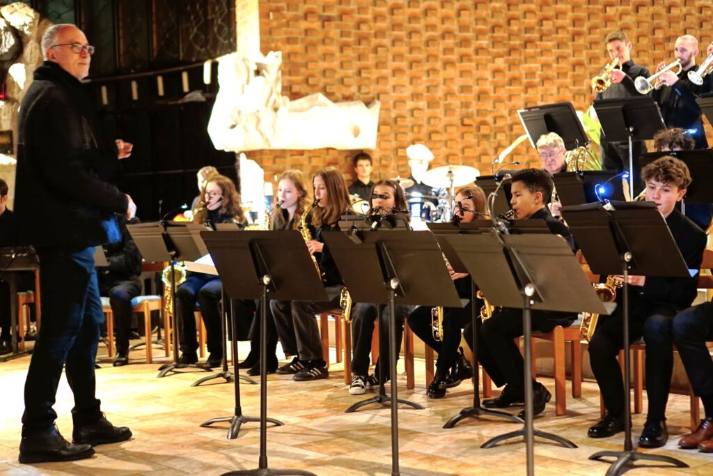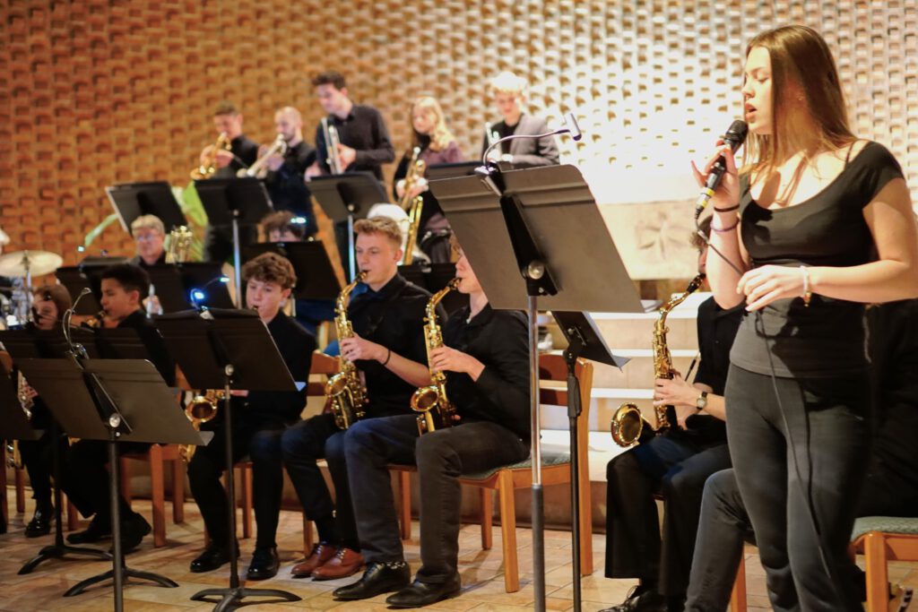 Nach der Pause bewies der Leo-Chor erneut stil- und intonationssicheres Können beim Umsetzen attraktiver Arrangements der bekannten Pop-Klassiker „Sound of Silence“, „Dancing Queen“ und „And so it goes“. Die Leo-Big Band mit ihrer exzellenten Vokal-Solistin Isabelle Kaminski (bei „Orange Coloured Sky“) sorgten unter der Leitung von Michael Beck mit drei energiegeladenen Jazz-Arrangements für einen stimmungsvoll-lockeren Abschluss des Konzertes.