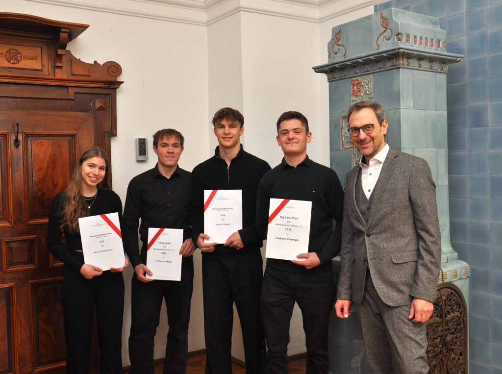 Neben den klangvollen Darbietungen standen auch Ehrungen für herausragende musikalische Leistungen aus dem Abiturjahrgang auf dem Programm: Der Reinhard-Raffalt-Preis 2026 ging an Nora Schlingmann und Severin Tausch, Clemens Kieninger erhielt den Big-Band-Preis und Christian Bloch wurde mit dem Preis des Musikalischen Vereins ausgezeichnet.