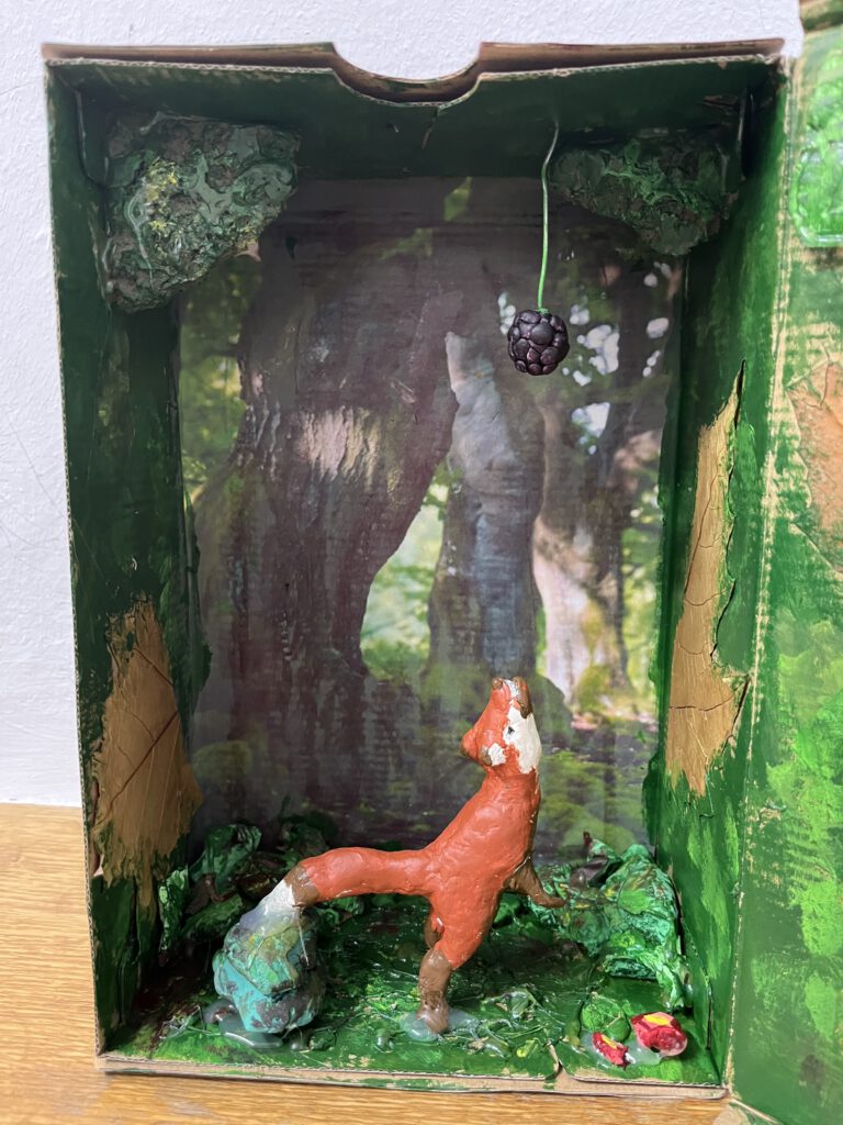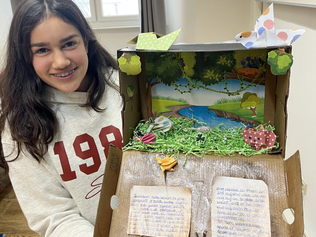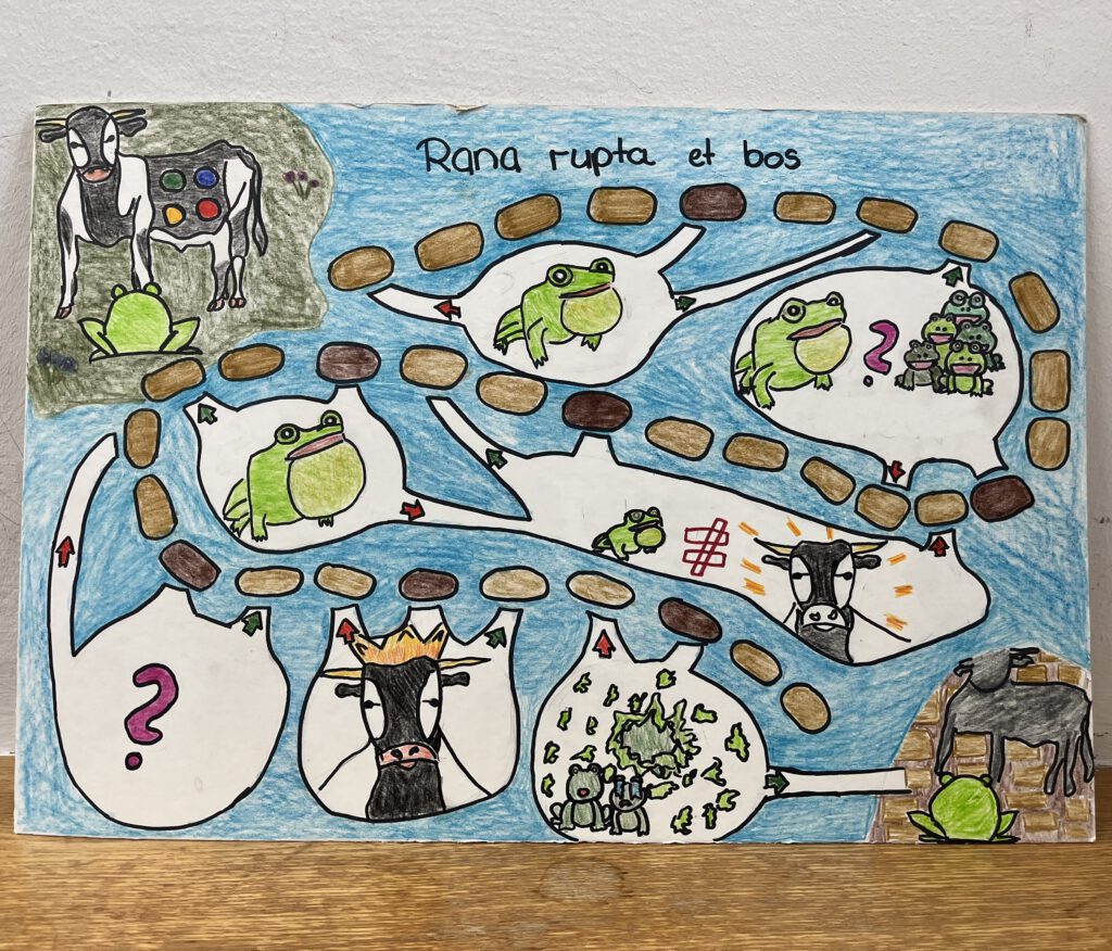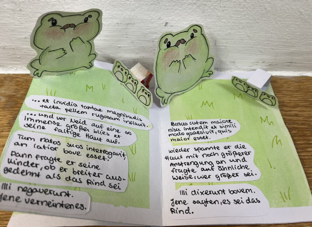 Nach der Übersetzung der Phädrus-Fabeln De vulpe et uva („Vom Fuchs und der Traube“) und Rana rupta et bos („Der geplatzte Frosch und der Ochse“) griffen die Schülerinnen und Schüler der 8a zu ganz unterschiedlichen künstlerischen Ausdrucksformen, um die Texte lebendig werden zu lassen. Sie gestalteten zum Beispiel kleine Bücher mit aufklappbaren Bildern, stellten die Figuren aus Fimo her, verfassten Gedichte und erstellten ein Spiel. Einige setzten die Fabeln auch digital in Form von kurzen Videoclips und Animationen um.