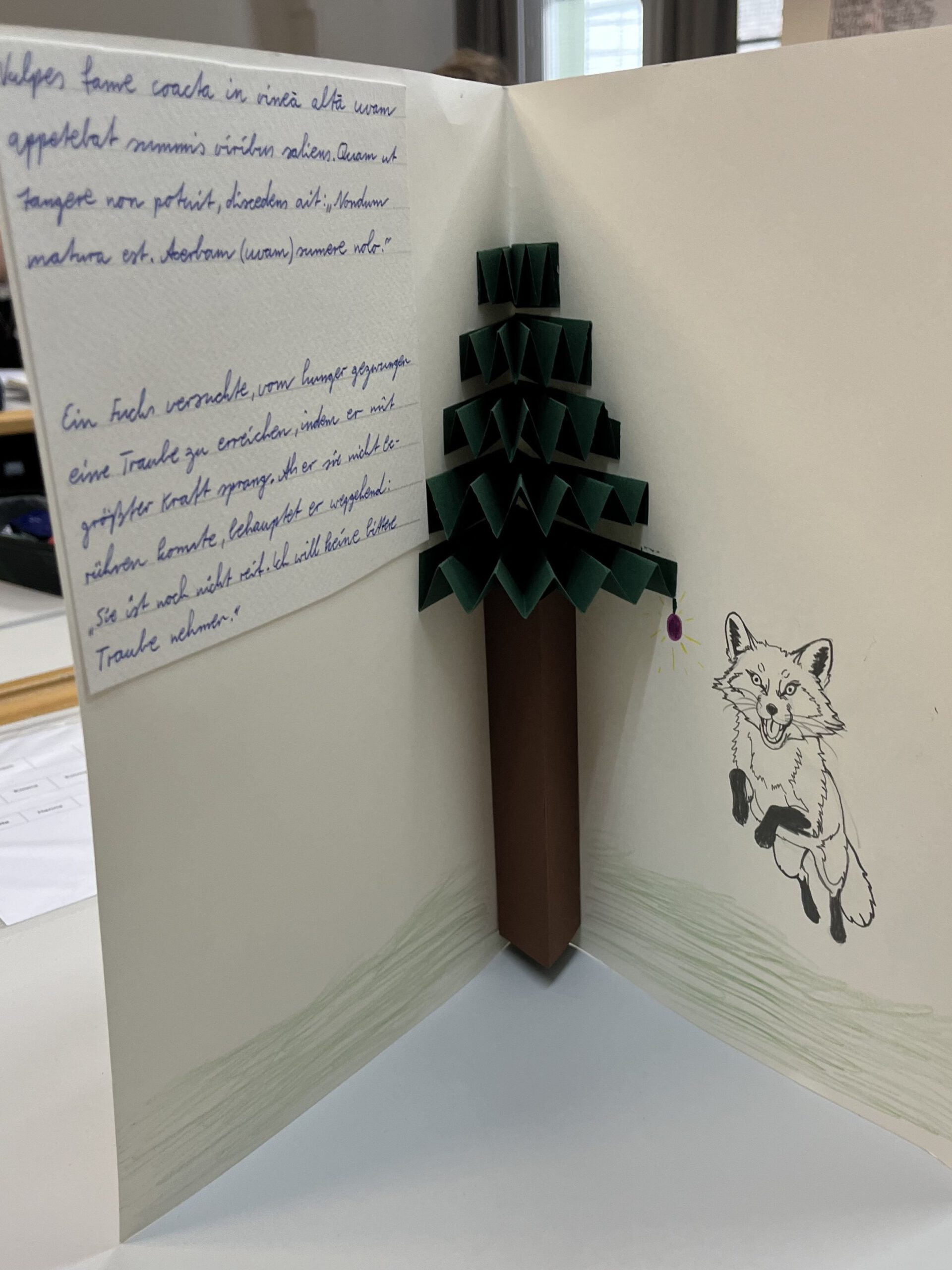 Nach der Übersetzung der Phädrus-Fabeln De vulpe et uva („Vom Fuchs und der Traube“) und Rana rupta et bos („Der geplatzte Frosch und der Ochse“) griffen die Schülerinnen und Schüler der 8a zu ganz unterschiedlichen künstlerischen Ausdrucksformen, um die Texte lebendig werden zu lassen. Sie gestalteten zum Beispiel kleine Bücher mit aufklappbaren Bildern, stellten die Figuren aus Fimo her, verfassten Gedichte und erstellten ein Spiel. Einige setzten die Fabeln auch digital in Form von kurzen Videoclips und Animationen um.