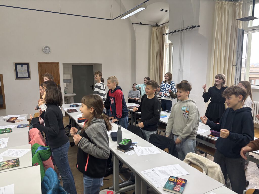 Im Fokus stand auch das Lesen kurzer Textausschnitte, wobei das bewusste Setzen und Füllen von Pausen sowie die Charakterentwicklung der Figuren durch verschiedene Emotionen geübt wurde. Abgerundet wurde der gelungene Tag durch ein spannendes Quiz in der Bibliothek des Leopoldinums, mit dem die Kinder noch tiefer in die Welt der Bücher eintauchen konnten.